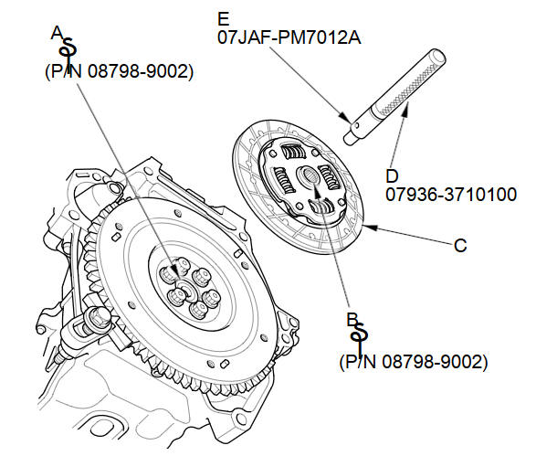 Apply super high temp urea grease (P/N 08798-9002) to the splines (B) of the clutch disc (C), then install the clutch disc using the remover handle (D) and the clutch alignment shaft (E).