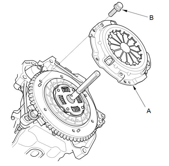 Install the pressure plate (A) and the mounting bolts (B) finger-tight.