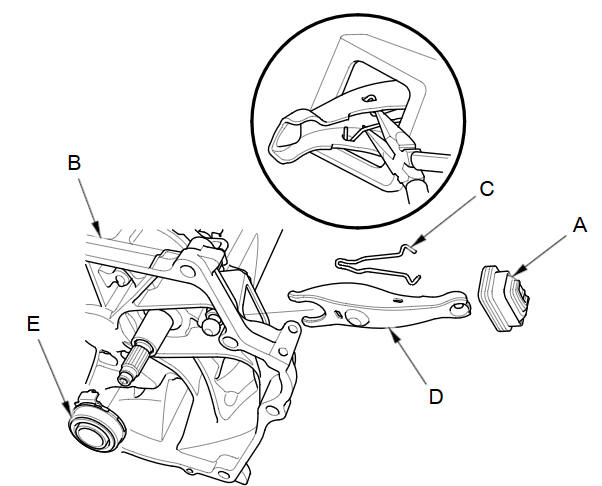 Squeeze the release fork set spring (C) with pliers to remove the release fork (D) from the clutch housing. Remove the release bearing (E).