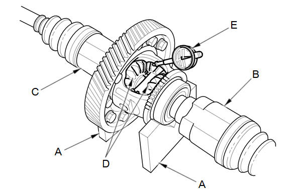 Measure the backlash of both pinion gears (D) with a dial indicator (E). If the backlash is not within the standard, replace the differential carrier.