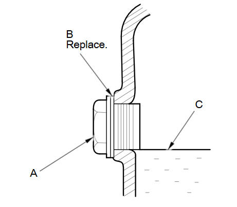 Remove the filler plug (A) and the sealing washer (B), check the condition of the MTF, and make sure it is at the proper level (C).