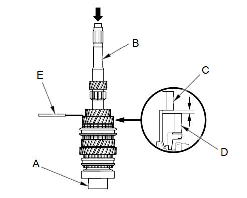 Measure the clearance between 2nd gear (C) and 3rd gear (D) gears with a feeler gauge (E).