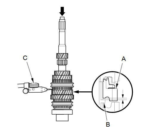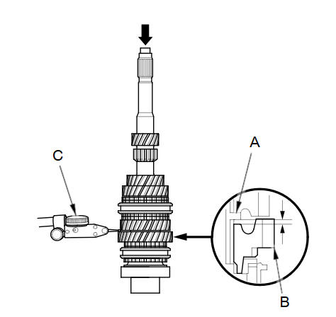 Measure the clearance between the 4th/5th gear distance collar (A) and 5th gear (B) with a dial indicator (C).