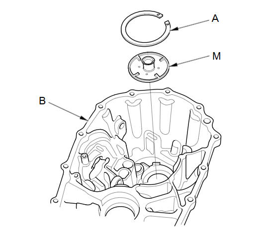 Remove the 72 mm shim (A) and oil guide plate M from the transmission housing (B).