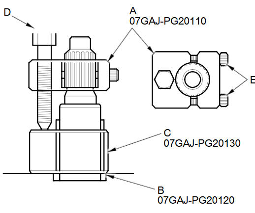 Back out the mainshaft holder bolt (D) and loosen the two hex bolts (E).