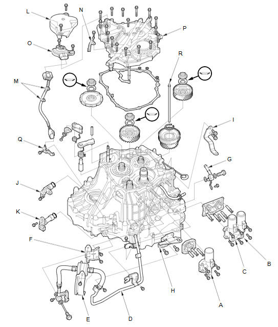 Remove the input shaft (mainshaft) speed sensor (J) and the output shaft (countershaft) speed sensor (K).