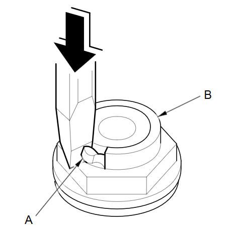 Using a chisel, cut the lock tab (A) off the each shaft locknut (B). Then remove the locknuts and conical spring washers from each shaft.