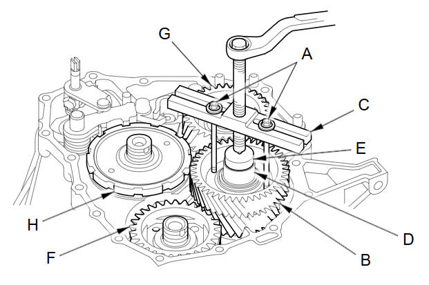 Set the puller, the 6 x 1.0 mm bolts, and the spacer on the park gear (H), and remove the park gear from the countershaft in the same manner as the removal of the idler gear shaft idler gear.