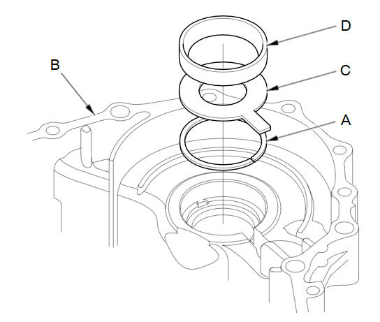 Install the 76.2 mm spacer (C) and the bearing outer race (D) in the transmission housing.