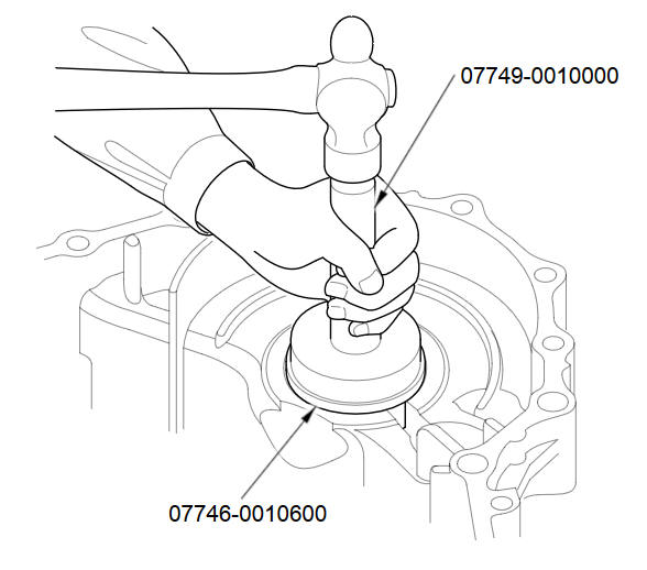 Drive the outer race securely in the housing using the driver handle and the bearing driver attachment (72 x 75 mm), so there is no clearance between the outer race, the spacer, the shim, and the housing.