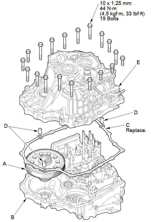 Install the transmission housing (E), and install the transmission housing mounting bolts. Tighten the 19 bolts to 44 N·m (4.5 kgf·m, 33 lbf·ft) in at least two steps in a crisscross pattern.