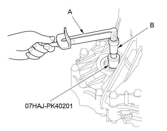 Measure the starting torque of the differential assembly with the special tool, a torque wrench (A), and a socket (B). Measure the staring torque at normal room temperature in both directions.