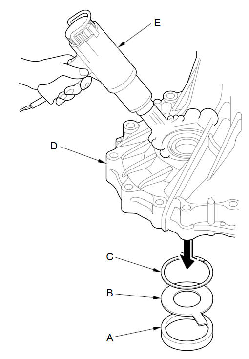 Remove the bearing outer race (A), the 76.2 mm spacer (B), and the 76 mm thrust shim (C) from the transmission housing (D) by heating the housing to about 212 °F (100 °C) with a heat gun (E). Do not heat the housing more than 212 °F (100 °C).