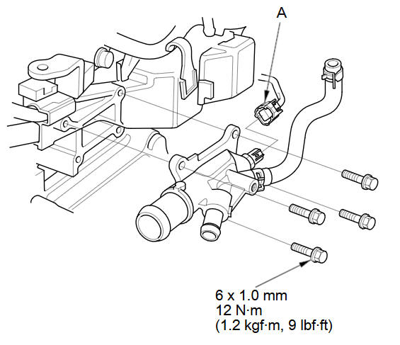 Install the water outlet, then connect the ECT sensor 1 connector (A).