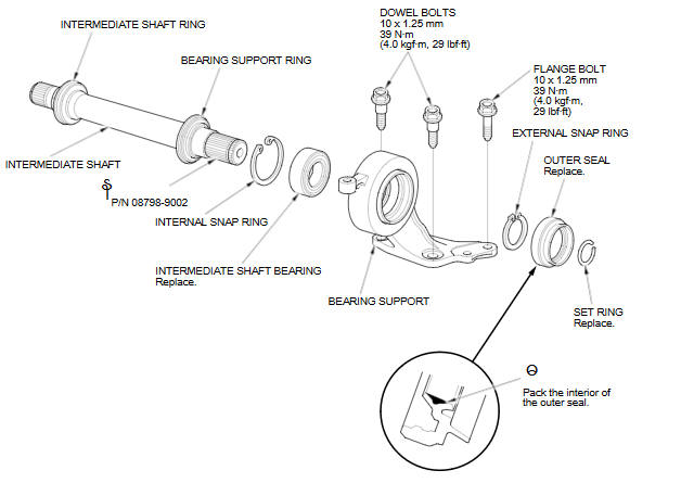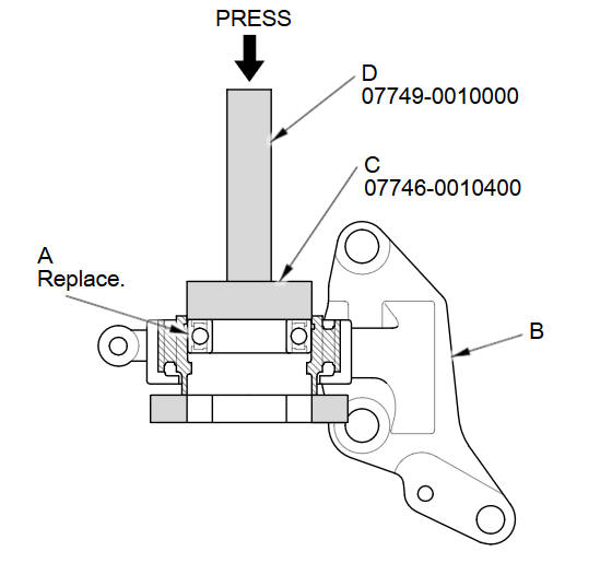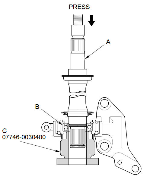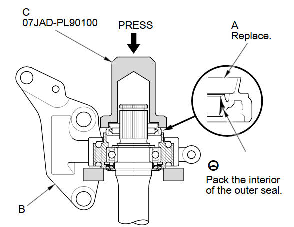 Install a new outer seal (A) into the bearing support (B) using the 65 mm oil seal driver (C) and a press. Press the seal until it is 0В±0.2 mm (0В±0.008 in) below the surface of the bearing support end.