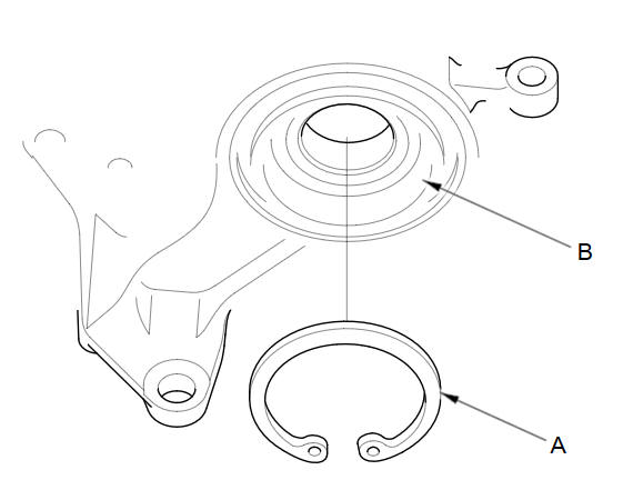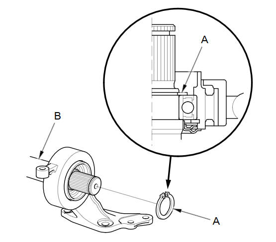 Install the internal snap ring (A) into the groove (B) of the bearing support.