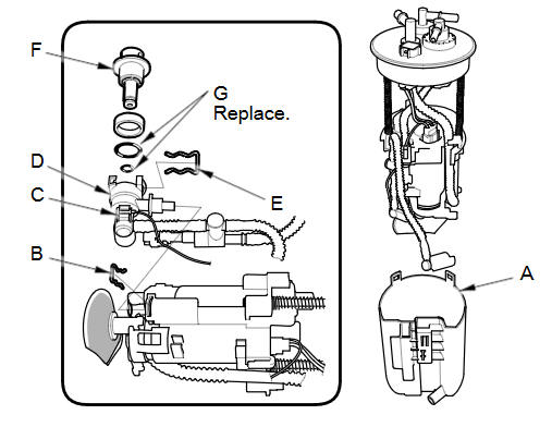 Install the parts in the reverse order of removal with new O-rings (G) and a new bracket. When installing the fuel tank unit, align the marks on the unit and the fuel tank.