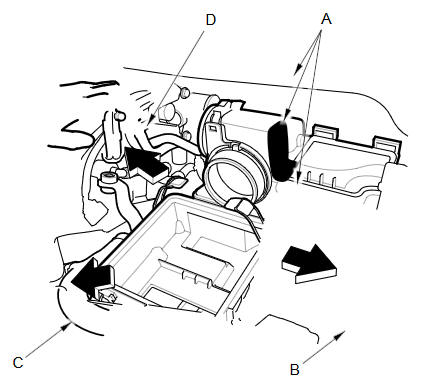 Remove the battery hold down, and reposition the battery (B). Reposition the radiator upper hose (C), and the breather pipe (D) as shown.