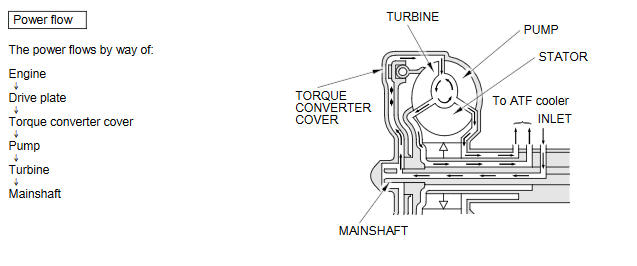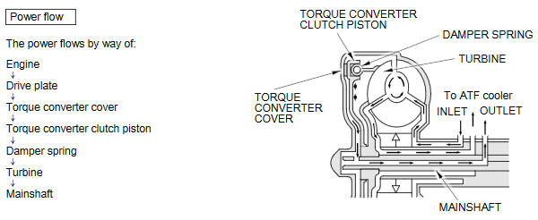 Fluid entered from the chamber between the torque converter cover and the torque converter clutch piston passes through the torque converter and goes out from the chambers between the turbine and the stator, and between the pump and the stator. As a result, the torque converter clutch piston moves away from the torque converter cover, and the torque converter clutch lock-up is released; torque converter clutch lock-up is OFF.
