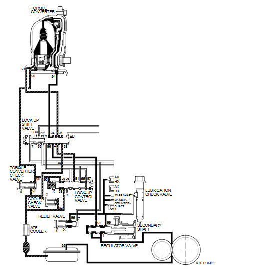 When the vehicle speed further increases, the PCM controls A/T clutch pressure control solenoid valve A to increase A/T clutch pressure control solenoid valve A pressure (55). A/T clutch pressure control solenoid valve A pressure (55) is applied to the lock-up control valve, and the lock-up control valve is moved to the left side to release torque converter back pressure (94). Torque converter pressure (91) enters into the front of the torque converter, and the torque converter clutch piston is securely engaged with the torque converter cover by torque converter pressure. Under this condition, torque converter back pressure is released fully, causing the torque converter clutch to be fully engaged; this condition is full lock-up.