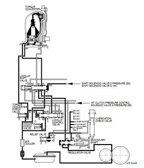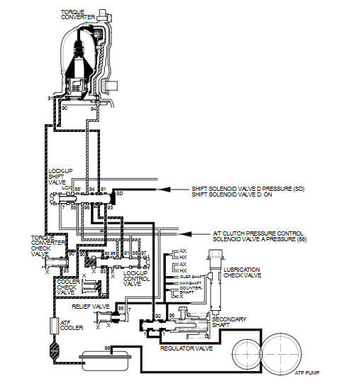 As the speed of the vehicle reaches the programmed value, the PCM turns shift solenoid valve D ON. Shift solenoid valve D pressure (SD) is applied to the right end of the lock-up shift valve to switch the torque converter pressure port leading to the front of the torque converter. Torque converter pressure (91) enters into the front of the torque converter to engage the torque converter clutch piston. The PCM also controls A/T clutch pressure control solenoid valve A to regulate A/T clutch pressure control solenoid valve A pressure (55), and A/T clutch pressure control solenoid valve A pressure (55) is applied to the lock-up control valve. Torque converter pressure (94) drained from the back of the torque converter is applied to the right side of the lock-up control valve, and torque converter pressure (90) is applied to the left side of the lock-up control valve. The lock-up control valve controls the amount of the lock-up by receiving these pressures. The torque converter clutch is engaged partially when torque converter pressure (90) in the left side of the lock-up control valve is higher, and the torque converter clutch is engaged securely according to the amount of pressure in the right side of the lock-up control valve. Under this condition, the torque converter clutch is engaged by pressure entering into the front side of the torque converter; this condition is partial lock-up.