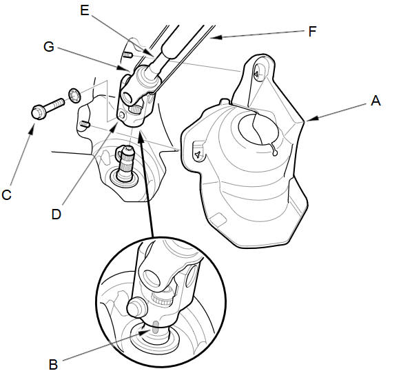 Make a reference mark (B) across the steering joint and the steering gearbox pinion shaft. Remove the steering joint bolt (C), and disconnect the steering joint (D) by removing the steering joint toward the steering column. Hold the slider shaft (E) on the column with a piece of wire (F) between the joint yoke (G) on the slider shaft to the joint yoke on the upper shaft.