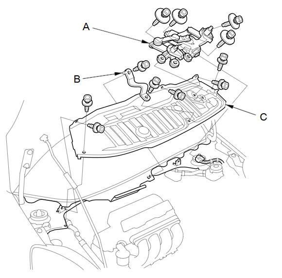 Remove the cowl cover stiffener (B) and center-front cowl cover (C).