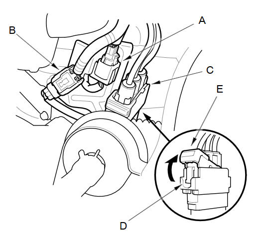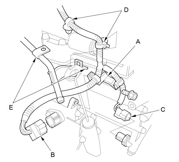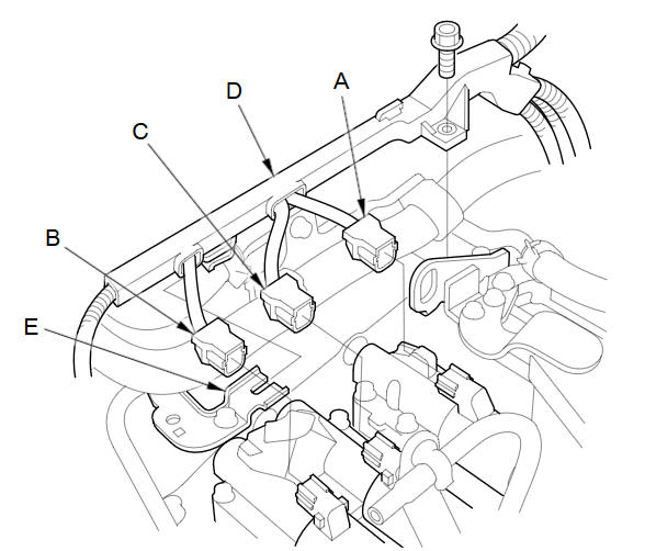 Disconnect the shift solenoid harness connector (B) and the transmission fluid pressure switch B (3rd clutch) connector (C), and remove the harness clamps (D) from the clamp brackets (E).