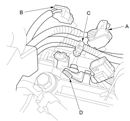 Disconnect the output shaft (countershaft) speed sensor connector (B), and remove the harness clamp (C) from its bracket (D).