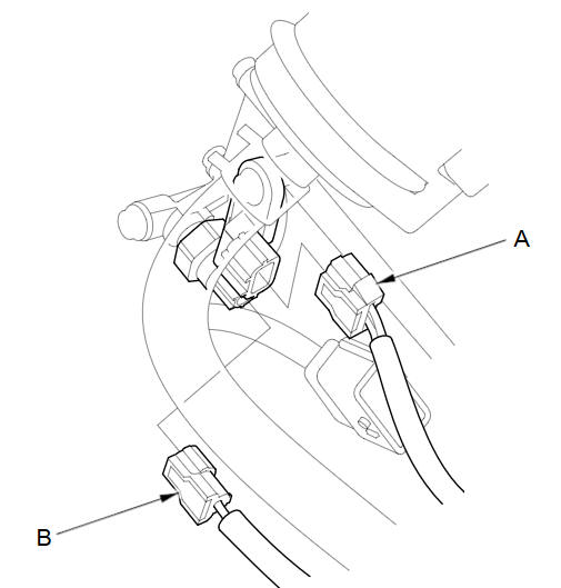 Disconnect the input shaft (mainshaft) speed sensor connector (A) and the transmission fluid pressure switch A (2nd clutch) connector (B).