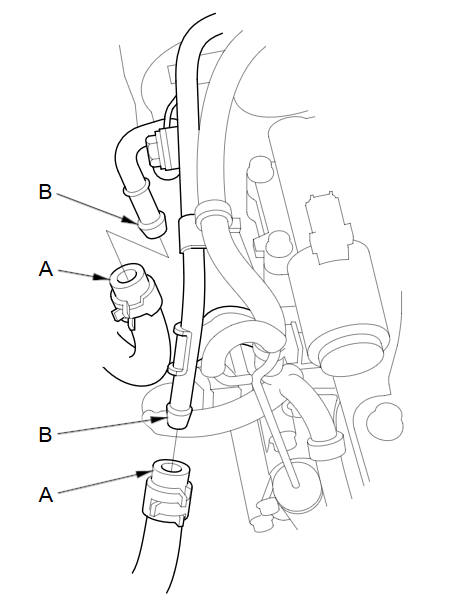 Remove the ATF cooler hoses (A) from the ATF cooler lines (B). Turn the ends of the cooler hoses up to prevent ATF from flowing out, then plug the cooler hoses and lines.