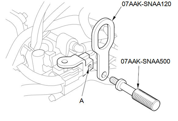 Install the universal lifting eyelet (07AAK-SNAA120) to the bolt hole (A) at the air cleaner housing mounting bracket with the 1.8 support bolt (07AAK-SNAA500).