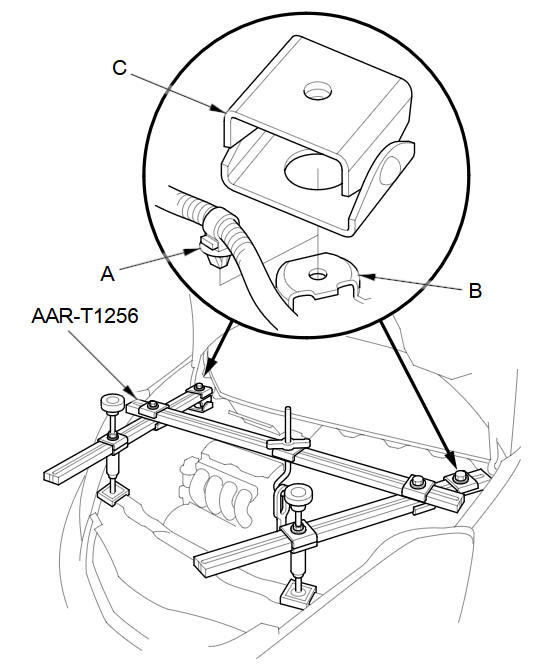 Set up the engine support hanger (AAR-T1256). Carefully position the engine support hanger to the vehicle; position both cross-arm foot bases (C) over the harness clamp brackets on both sides, and position both front stands on the front bulkhead. Attach the hook to the universal eyelet, tighten the wing nut by hand, and lift and support the engine.