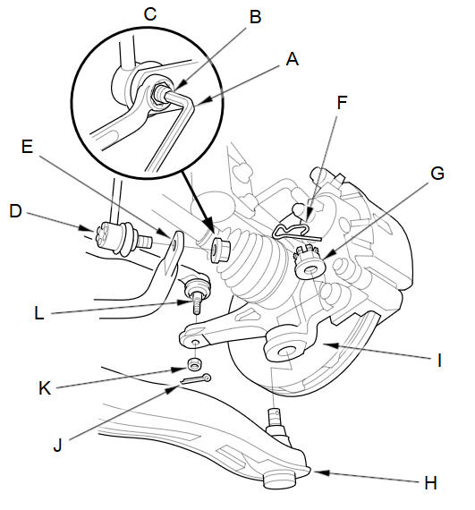 Remove the cotter pins (J) and the nuts (K), and separate the tie-rod end ball joint (L) from the knuckles.