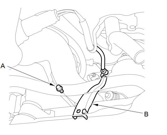 Remove the 6.0 mm bolt (A) securing the secondary HO2S wire clamp (B) on the steering gearbox. Do not disconnect secondary HO2S 4P connector and secondary HO2S.