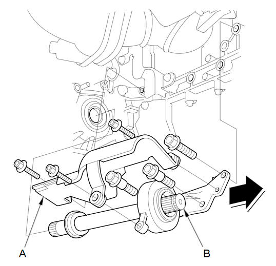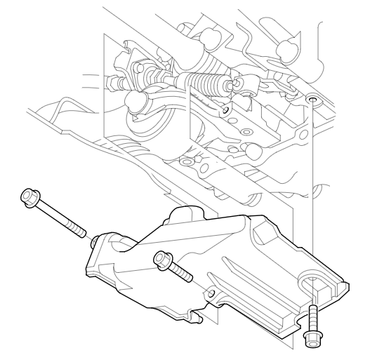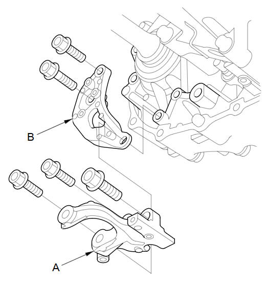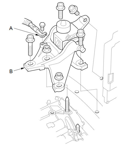 Remove the lower torque rod mounting bracket (A) and the shift cable holder bracket (B).