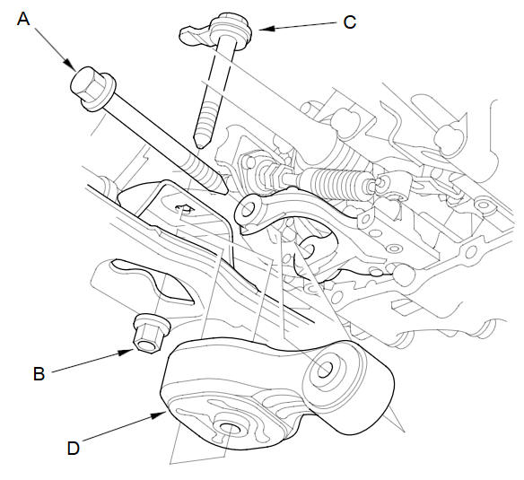 Place a jack under the transmission, raise it just enough to take it off of the lower torque rod, and remove the lower torque rod bolt (A) on the transmission.
