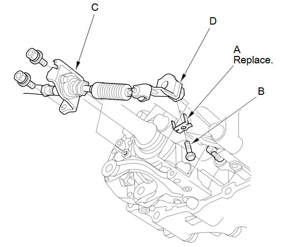 Remove the bolts securing the shift cable holder (C), and separate the shift cable (D) from the selector control shaft end. Do not bend the shift cable excessively.