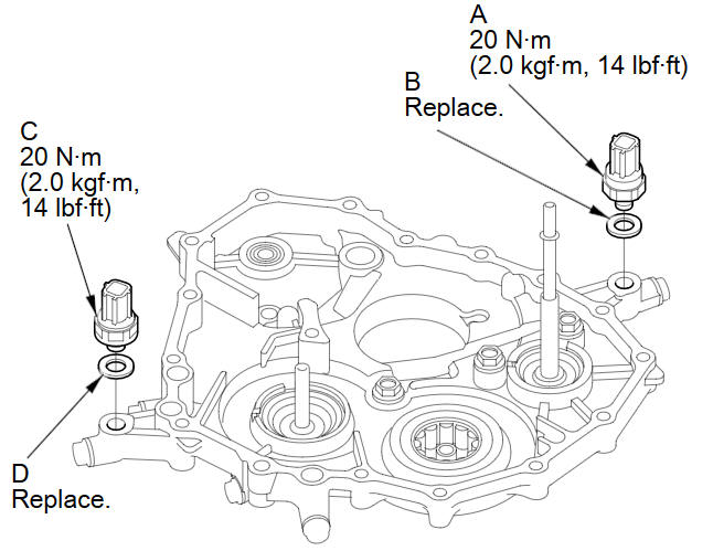 Install the new transmission fluid pressure switch B (3rd clutch) and a new sealing washer (D), and tighten the metal part of the switch.
