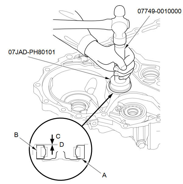 Install the new countershaft bearing (B) in the housing using the driver handle and the oil seal driver attachment (58 mm); install the bearing outer race surface in height (C) of 0.03 mm (0.001 in) above the housing surface (D). Do not install the bearing exceeding 0.03 mm (0.001 in) high from housing surface.