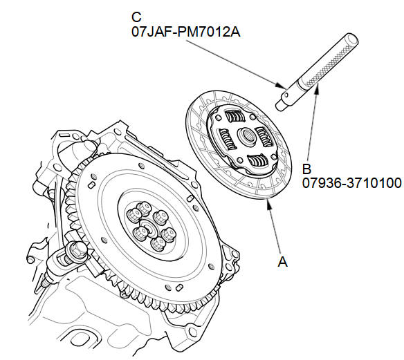 Remove the clutch disc (A), the remover handle (B), and the clutch alignment shaft (C).