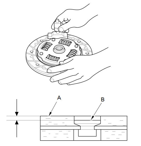 Measure the rivet depth from the clutch disc lining surface (A) to the rivets (B) on both sides. If the measurement is less than the service limit, replace the clutch disc.